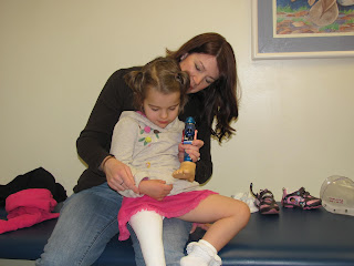 Today, Laura got to try on her very first prostheic leg, so our prosthetist, could make some adjustments. The good news is Laura is healing from her surgery nicely and we are one day closer to Laura walking! The bad news is, we need to go back again next week for an addtional fitting. The prosthetist is unsure if she can find some smaller parts needed so that Laura will have a bendable knee. Laura's entire right leg is a tiny bit longer then her left leg at the knee. Laura may need to grow another inch or two before a prosthetic knee can be used. She will still have a prosthetic leg but the first one just wouldn't bend. We will learn more at next weeks visit.